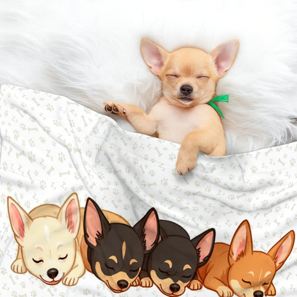 Con ilustraciones adorables de Chihuahuas y una textura doble irresistible, esta manta no solo es funcional: también es una muestra de cariño que acompaña a %%petName%% en el sofá, la cama o el asiento del coche.