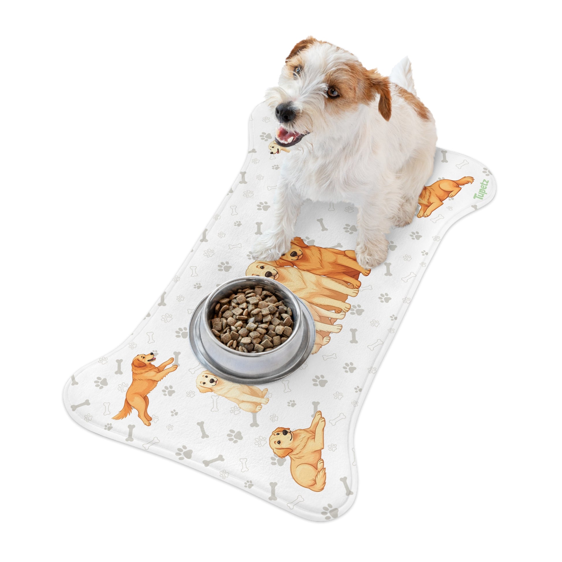 Mantén el rincón de comida de %%petName%% limpio y con estilo con este tapete exclusivo con forma de hueso, pensado para perros con gran apetito y aún mayor encanto. Diseñado con ilustraciones adorables de Golden Retrievers, combina funcionalidad, ternura y un toque divertido que hará que cada comida sea especial.
